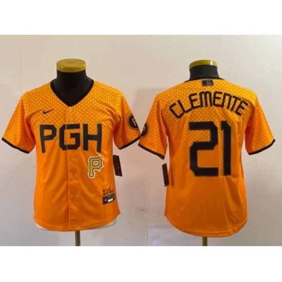 Youth Nike Pittsburgh Pirates #21 Roberto Clemente Yellow 2023 City Connect Stitched Jersey