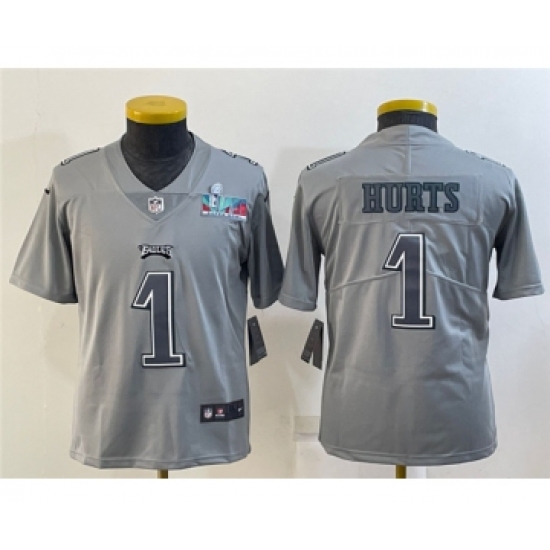 >Youth Philadelphia Eagles #1 Jalen Hurts Gray Super Bowl LVII Atmosphere Fashion Stitched Football Jersey
