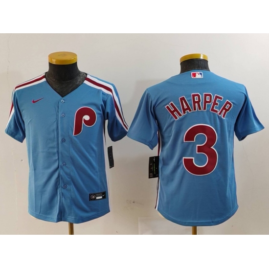 >Youth Philadelphia Phillies #3 Bryce Harper Light Blue Cooperstown Cool Base Jersey