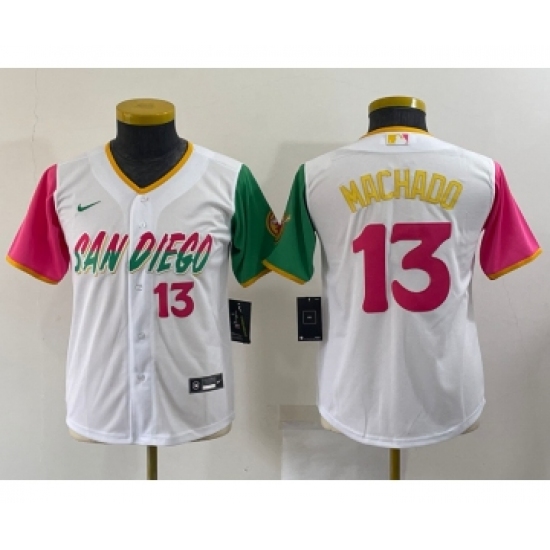 Youth San Diego Padres #13 Manny Machado White Number 2022 City Connect Cool Base Stitched Jersey