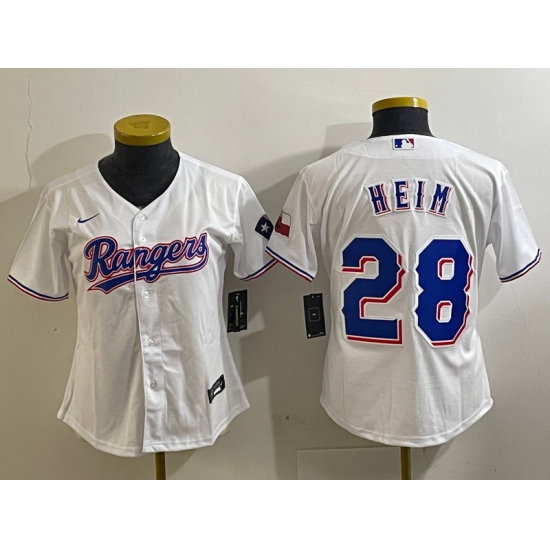 Women's Texas Rangers #28 Jonah Heim Nike White Home 2023 World Series Champions Replica Player Jersey