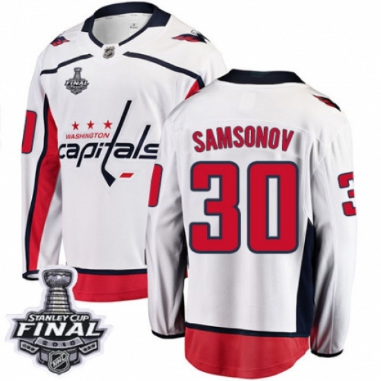 Men's Washington Capitals #30 Ilya Samsonov Fanatics Branded White Away Breakaway 2018 Stanley Cup Final Champions NHL Jersey