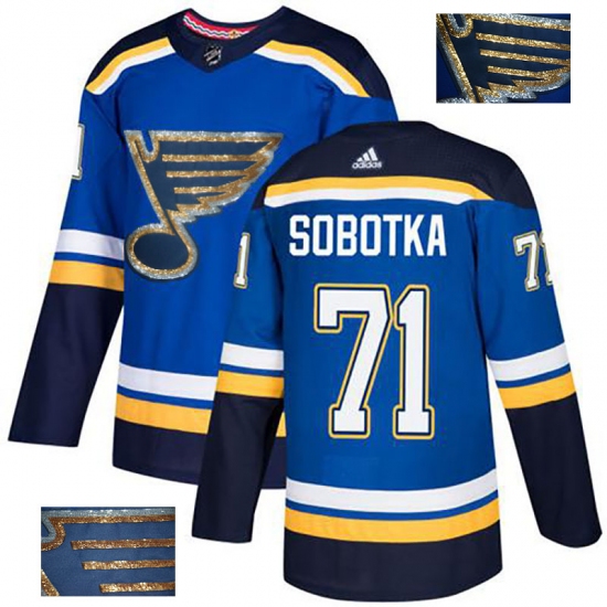 >Men's Adidas St. Louis Blues #71 Vladimir Sobotka Authentic Royal Blue Fashion Gold NHL Jersey