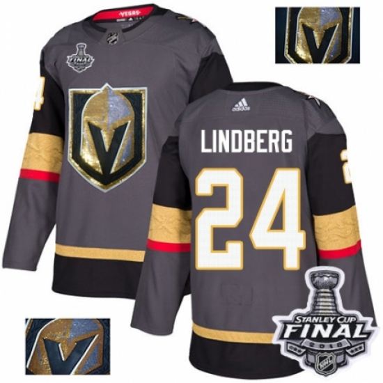 >Men's Adidas Vegas Golden Knights #24 Oscar Lindberg Authentic Gray Fashion Gold 2018 Stanley Cup Final NHL Jersey