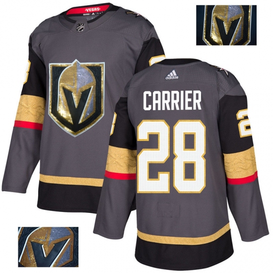 >Men's Adidas Vegas Golden Knights #28 William Carrier Authentic Gray Fashion Gold NHL Jersey