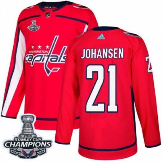 Men's Adidas Washington Capitals #21 Lucas Johansen Authentic Red Home 2018 Stanley Cup Final Champions NHL Jersey