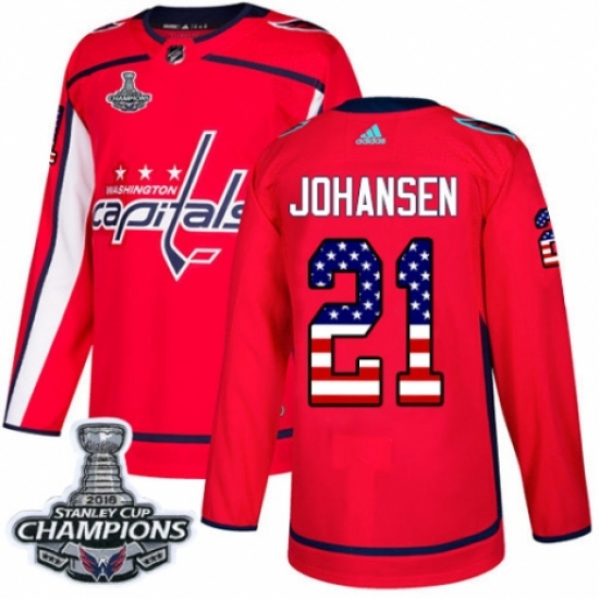 Men's Adidas Washington Capitals #21 Lucas Johansen Authentic Red USA Flag Fashion 2018 Stanley Cup Final Champions NHL Jersey