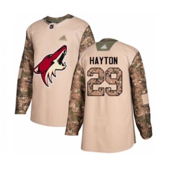 Men's Arizona Coyotes #29 Barrett Hayton Authentic Camo Veterans Day Practice Hockey Jersey