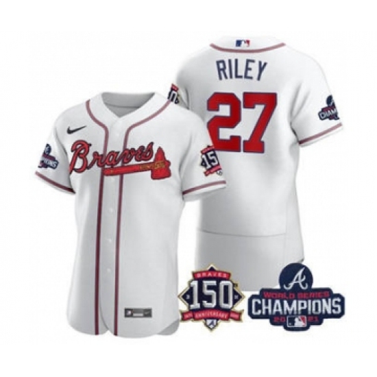 Men's Atlanta Braves #27 Austin Riley 2021 White World Series Champions With 150th Anniversary Flex Base Stitched Jersey
