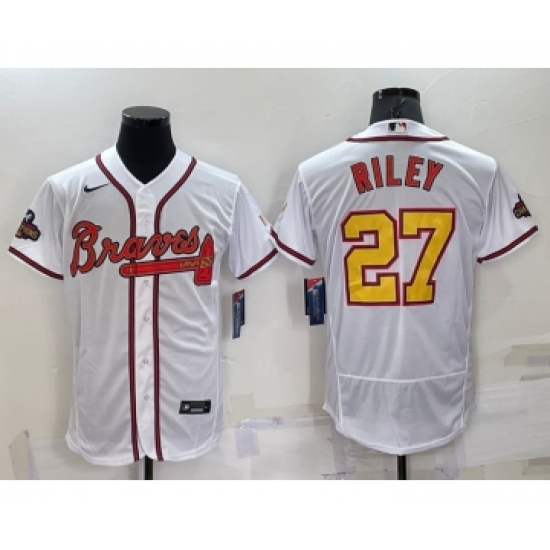 Men's Atlanta Braves #27 Austin Riley White Gold 2021 World Series Champions Stitched MLB Flex Base Jersey