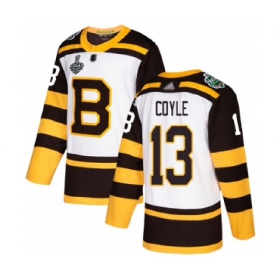 >Men's Boston Bruins #13 Charlie Coyle Authentic White Winter Classic 2019 Stanley Cup Final Bound Hockey Jersey