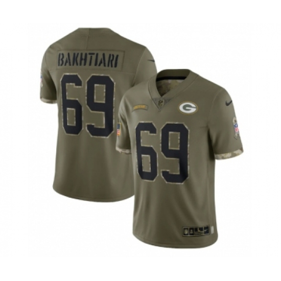 >Men's Green Bay Packers #69 David Bakhtiari 2022 Olive Salute To Service Limited Stitched Jersey