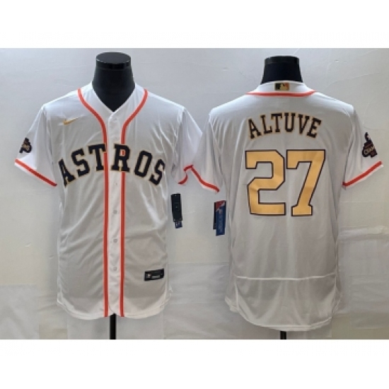 >Men's Houston Astros #27 Jose Altuve 2023 White Gold World Serise Champions Flex Base Stitched Jersey