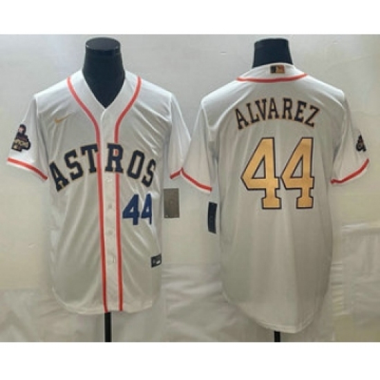 Mens Houston Astros #44 Yordan Alvarez Number 2023 White Gold World Serise Champions Cool Base Stitched Jersey