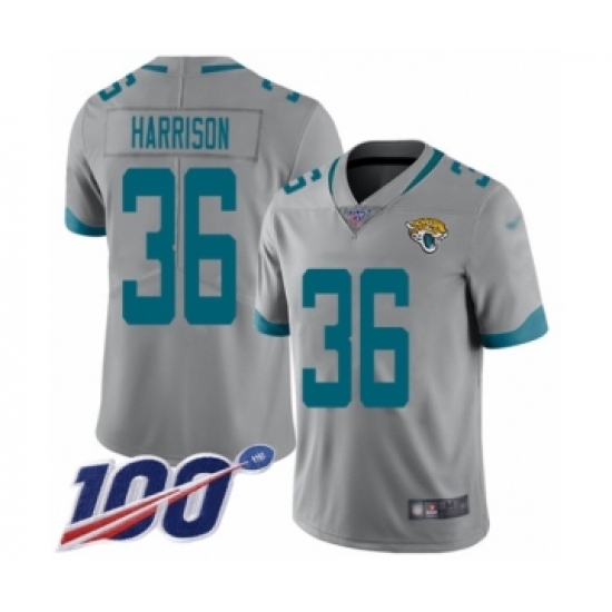>Men's Jacksonville Jaguars #36 Ronnie Harrison Silver Inverted Legend Limited 100th Season Football Jersey