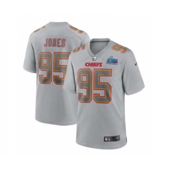>Men's Kansas City Chiefs #95 Chris Jones Gray Super Bowl LVII Patch Atmosphere Fashion Stitched Game Jersey