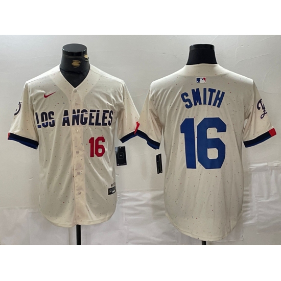 >Men's Los Angeles Dodgers #16 Will Smith Number Cream 2024 City Connect Limited Stitched Jersey