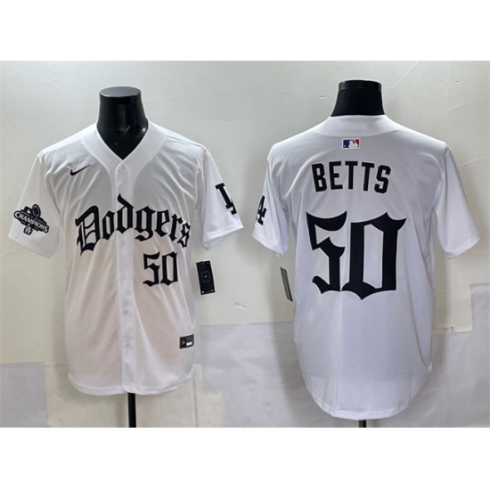 >Men's Los Angeles Dodgers #50 Mookie Betts White 2025 LA Gothic Style With 2024 World Series Champions Vapor Premier Limited Stitched Baseball Jersey