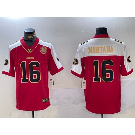 >Men's San Francisco 49ers #16 Joe Montana Red Gold FUSE Gate Bridge Vapor Limited Stitched Jersey