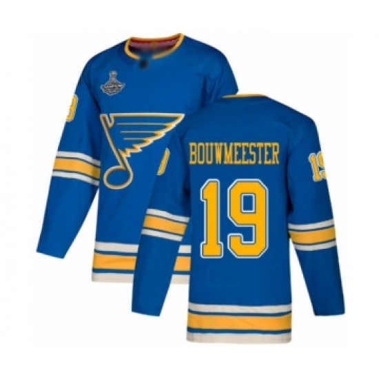 >Men's St. Louis Blues #19 Jay Bouwmeester Authentic Navy Blue Alternate 2019 Stanley Cup Champions Hockey Jersey