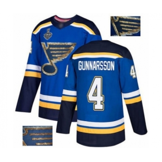 >Men's St. Louis Blues #4 Carl Gunnarsson Authentic Royal Blue Fashion Gold 2019 Stanley Cup Final Bound Hockey Jersey