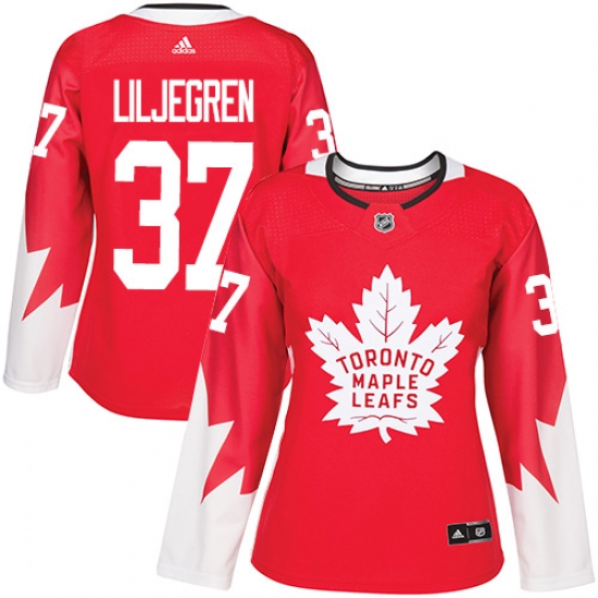 >Women's Adidas Toronto Maple Leafs #37 Timothy Liljegren Authentic Red Alternate NHL Jersey