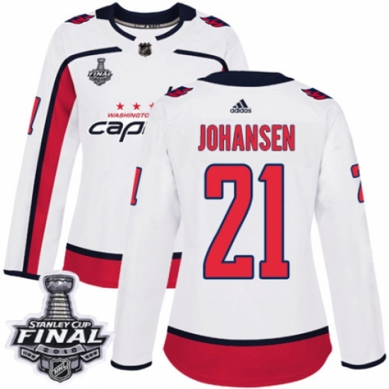 Women's Adidas Washington Capitals #21 Lucas Johansen Authentic White Away 2018 Stanley Cup Final NHL Jersey