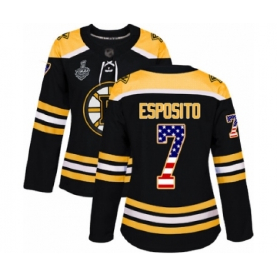 >Women's Boston Bruins #7 Phil Esposito Authentic Black USA Flag Fashion 2019 Stanley Cup Final Bound Hockey Jersey