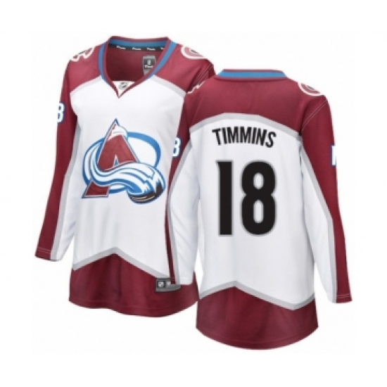 >Women's Colorado Avalanche #18 Conor Timmins Authentic White Away Fanatics Branded Breakaway NHL Jersey