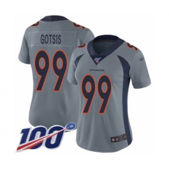 >Women's Denver Broncos #99 Adam Gotsis Limited Silver Inverted Legend 100th Season Football Jersey