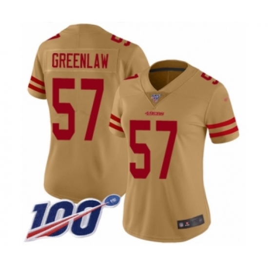 >Women's San Francisco 49ers #57 Dre Greenlaw Limited Gold Inverted Legend 100th Season Football Jersey