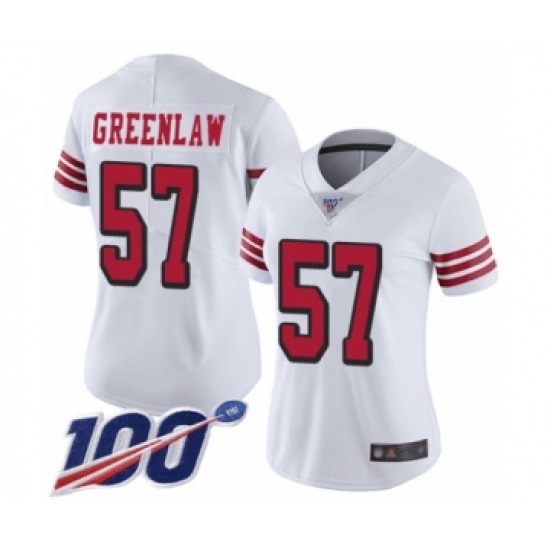 >Women's San Francisco 49ers #57 Dre Greenlaw Limited White Rush Vapor Untouchable 100th Season Football Jersey