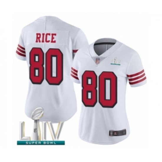 >Women's San Francisco 49ers #80 Jerry Rice Limited White Rush Vapor Untouchable Super Bowl LIV Bound Football Jersey