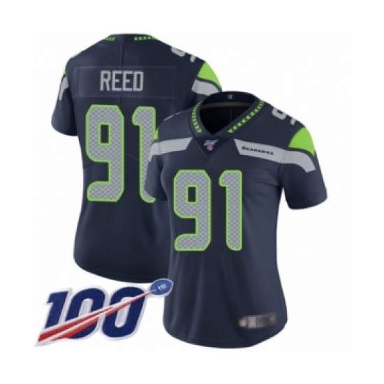 >Women's Seattle Seahawks #91 Jarran Reed Navy Blue Team Color Vapor Untouchable Limited Player 100th Season Football Jersey