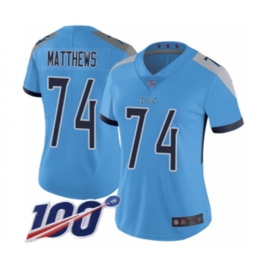 >Women's Tennessee Titans #74 Bruce Matthews Light Blue Alternate Vapor Untouchable Limited Player 100th Season Football Jersey