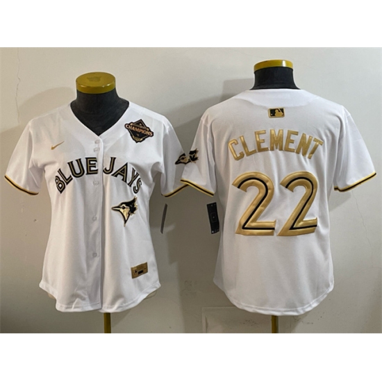 >Women's Toronto Blue Jays #22 Ernie Clement White Gold 2025 American League Champions Limited Stitched Baseball Jersey(Run Small)