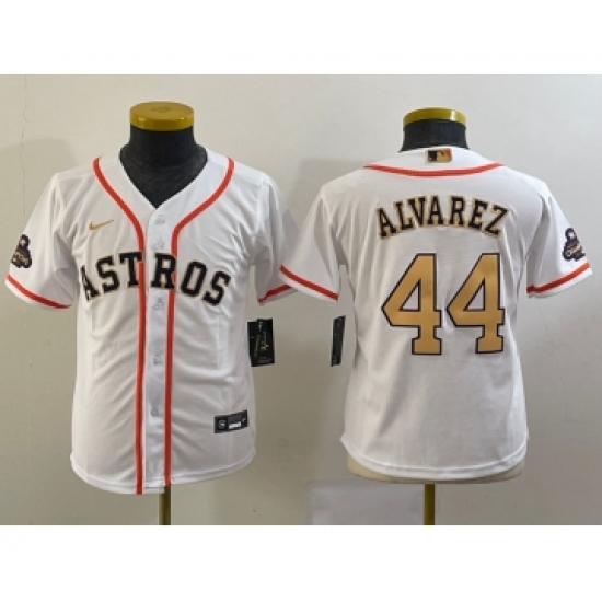 >Youth Houston Astros #44 Yordan Alvarez 2023 White Gold World Serise Champions Cool Base Stitched Jersey